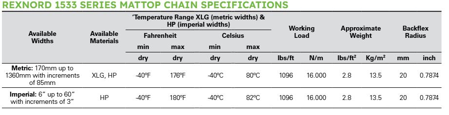 Rexnord™ 1533 MatTop™ är en kedja med LBP-design ackumulerande modulband, konstruerad för att transportera olika typer av förpackningar, öka säkerhet och stabilitet samt leverera långvarig hållbarhet jämfört med andra kedjor på marknaden.